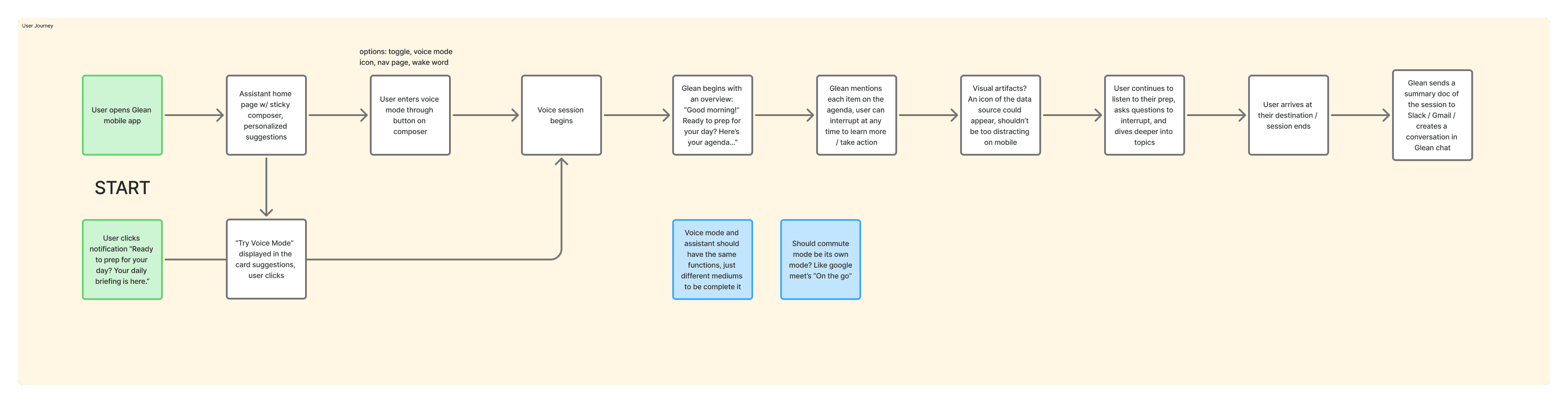 Given the scope and time constraints of the project, I decided to focus on the first concept, live brainstorming and chatting, as it felt both high-impact and directly addressed user needs around fast, on-the-go ideation and exploratory thinking. The next step was mapping out user journeys and system architectures to define how a knowledge worker might interact with the assistant, where they enter voice mode, how the conversation flows, and what outputs (like summaries or action items) they receive at the end.