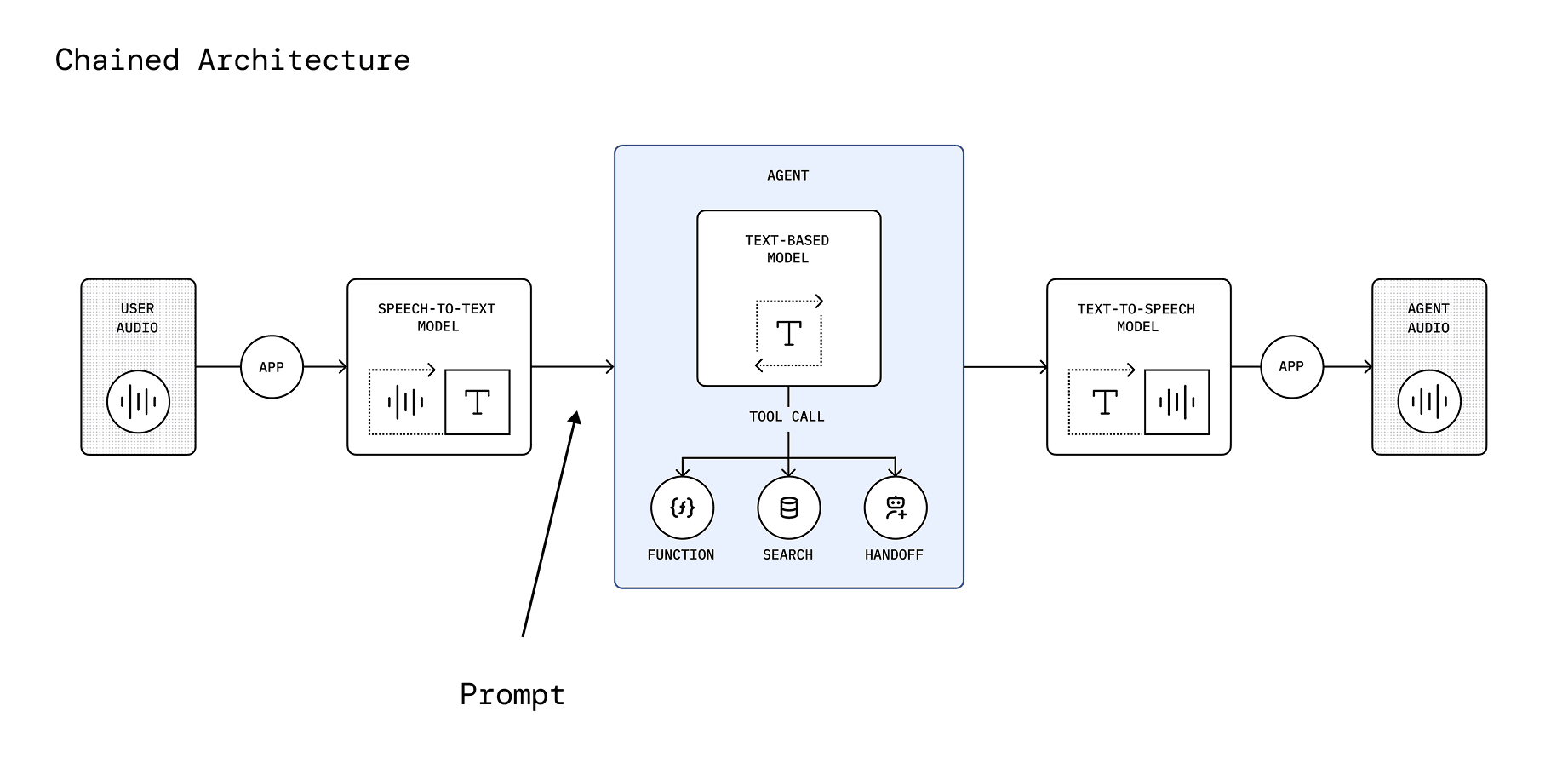 At a high level, it processes audio step-by-step: first, the user’s speech is converted to text by a speech-to-text model. Then, the text is passed to an intelligent agent — a large language model (LLM) — which generates a response in text form. Finally, that response is converted back into speech using a text-to-speech model, producing the audio reply you hear.