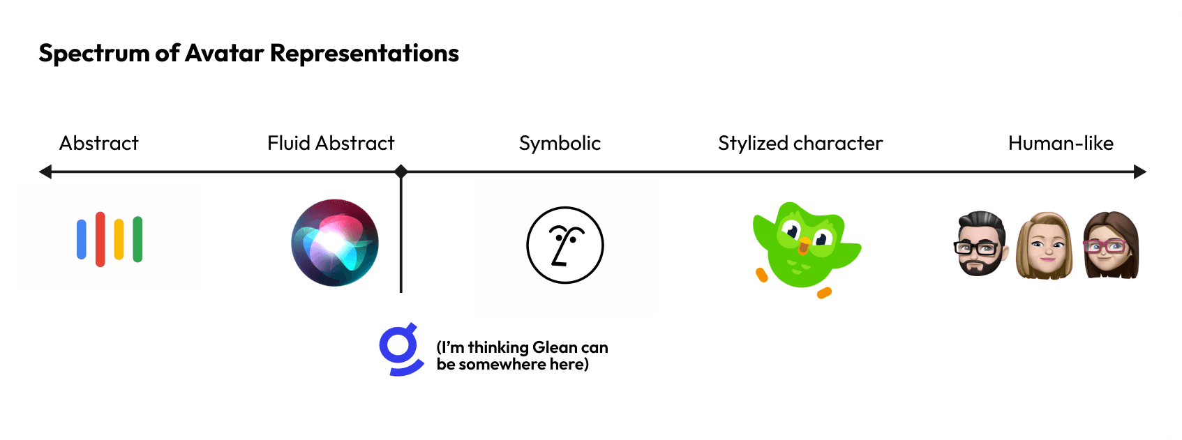 The spectrum below shows a range of avatar styles for voice assistants, and for Glean, a direction closest to fluid abstract felt most appropriate as it still maintains professionalism while avoiding the stiffness of pure abstraction or the informality of cartoon characters. Since Glean's product is designed for work-related interactions and is less of a product you talk to for fun, the avatar should be simple and non-distracting but still expressive enough to be engaging to interact with.