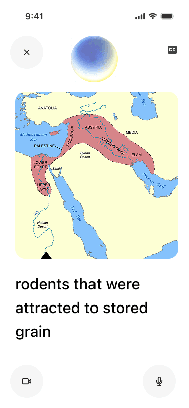 Voice as a separate mode with text toggle — users speak to the assistant but can choose to toggle on Glean’s text responses through a 'CC' button, with large, easy-to-read captions.