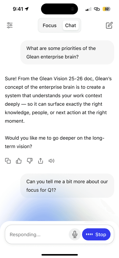 Voice mode is currently in beta with 30+ Glean customers. It brings together the conversation loop, Focus and Chat modes, interaction states, onboarding, voice settings, and agentic actions into a single, cohesive product — designed to feel native to Glean and ready for real use. Customer feedback has been overwhelmingly positive — users are returning daily, and the reception has reinforced that voice fills a real gap in how people want to engage with Glean throughout their day.