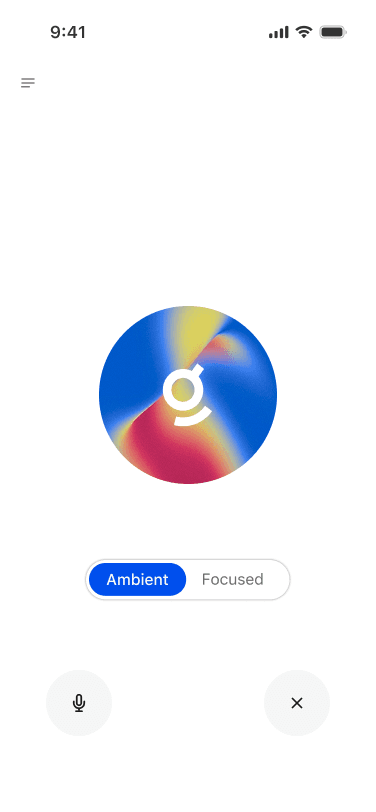 Early explorations varied significantly: some leaned into a chat-first UI where responses and sources appeared inline, keeping the experience close to Glean's existing assistant. Others pushed toward a more immersive, audio-first experience centered around a visual orb with minimal text. I also explored how the two modes could coexist — giving users a way to move between a focused, eyes-free experience and a more readable, transcript-style view depending on context.