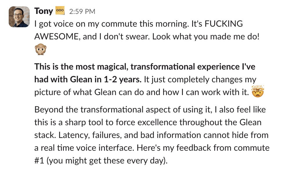 Here was some passionate feedback from Glean's co-founder, Tony.